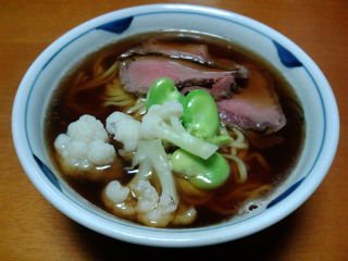 写真うつり悪い。笑 チャーシューのかわりにローストビーフ、かりふらわーと空豆